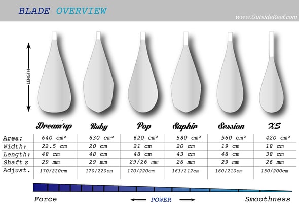 Enfin, nous avons remarqué avec nos nombreux rideurs et rideuses, que plus on progressait et plus on avait un bon niveau, plus on avait tendance à réduire sa surface de pale. A contrario quand on est débutant, une pale un peu plus grosse sera plus facile, car elle fournira plus facilement un appui franc sur l'eau.